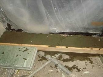El umbral se aplica para el montaje, si la superficie es uniforme, se comprueba mediante un nivel. Si necesita cortar la estructura, esto se hace ahora. Si el umbral se ha acercado, pero la superficie es irregular, se instalan sustratos debajo de las barras. Y pueden ser de cualquier material, por ejemplo, el mismo plástico o fragmentos de placa de yeso.