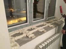 - Los sujetadores se realizan sobre una capa de espuma. Es importante tener en cuenta que la composición se ampliará en el futuro. Después de aplicar la composición y distribuirla, debe colocar una placa para el alféizar de la ventana debajo del marco y fijarla durante varias horas. Se pueden utilizar pesos y otros objetos pesados como agentes de ponderación. Las juntas deben recubrirse con sellador.