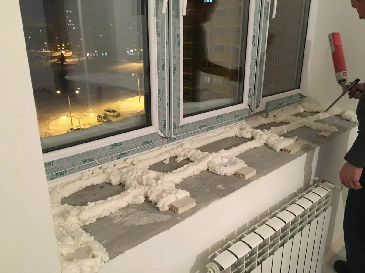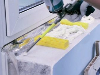 - Luego, es necesario aplicar espuma a la superficie, lo que proporcionará una excelente fijación de la losa del alféizar de la ventana. No se exceda con la espuma, ya que se expande con el tiempo.