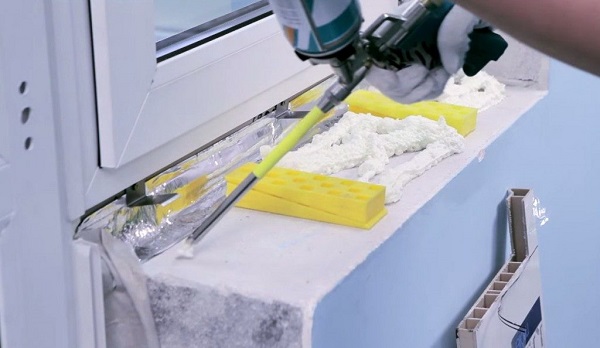 - Espuma de poliuretano. Según los expertos, la mejor opción sería un equipo profesional especial. La espuma se puede dispensar fácilmente con una pistola de poliuretano. La espuma tiene una estructura porosa, los poros son pequeños. Pero también puede usar latas de aerosol estándar. La composición del material también es importante: la espuma debe tener bajas tasas de expansión; de lo contrario, como resultado de la polimerización, el alféizar de la ventana simplemente se elevará.