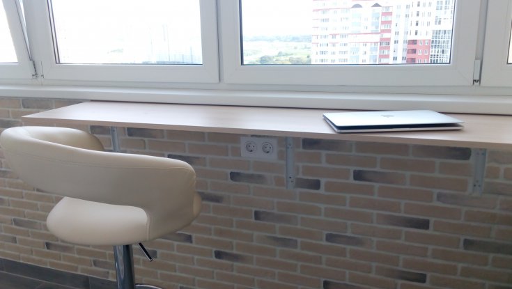 Una mesa plegable en forma de alféizar de una ventana también puede "funcionar" como una mesa completa para recibir invitados (la opción es relevante si se crea una barra improvisada o una sala de estar en el balcón o logia).