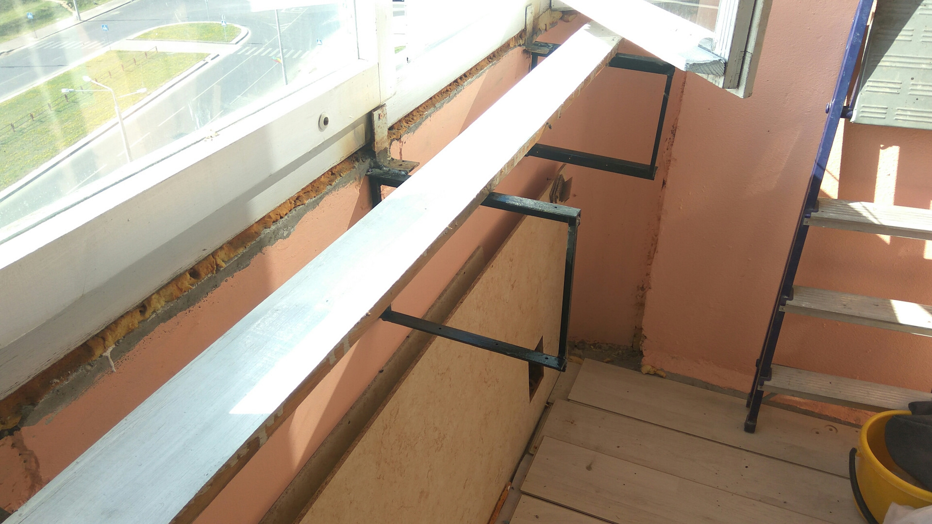 - Las marcas de los soportes permanecen en las paredes. De acuerdo con la marca, debe hacer agujeros en los que se instalan las clavijas. Luego se colocan los soportes. La construcción resultante resistirá fácilmente el alféizar de la ventana.