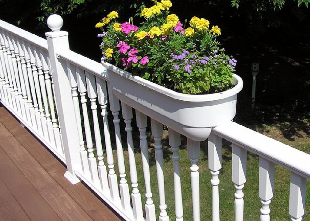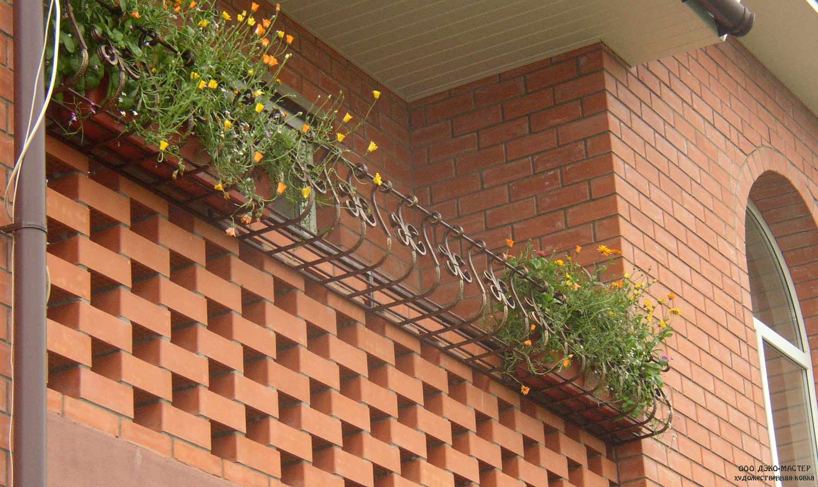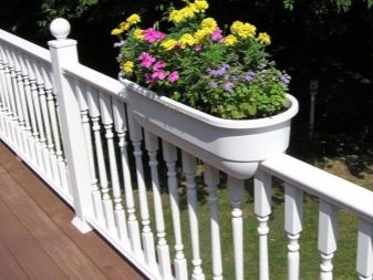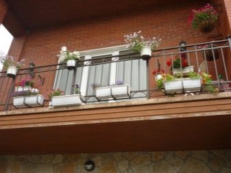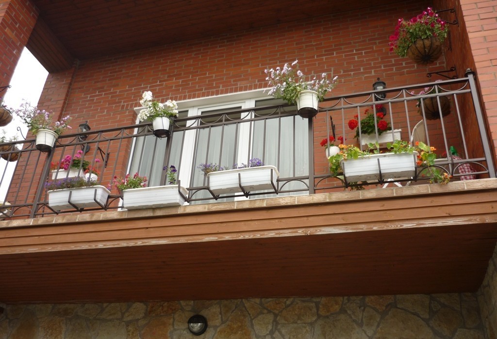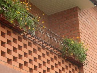 La maceta también se puede colocar directamente en el parapeto, pero entonces será imposible apoyarse en ella: puede dejar caer o dañar la planta accidentalmente. Idealmente, las macetas rectangulares y cuadradas se colocarán de manera constante en la barandilla del parapeto. La barra debe ser plana y ancha. Si el parapeto contiene solo una barra de refuerzo como barra transversal superior, entonces se suelda una segunda pieza de refuerzo similar paralela a ella, y se colocan dos de sujeción a los lados para que la olla no se caiga. Se crea espacio adicional, lo que le permite colocar macetas en una fila sin ninguna consecuencia. Las varillas de refuerzo laterales están ubicadas al menos unos centímetros por encima de las principales, a cada lado de ellas, por dentro y por fuera. La construcción resultante sostendrá de forma segura macetas y cajas. En este caso, el fondo de la olla o caja es mucho más ancho que el espacio entre las principales piezas de refuerzo que forman el travesaño del parapeto. En el caso de que una tira de hierro actúe como travesaño, solo los espaciadores longitudinales laterales son suficientes para que las macetas o cajas con flores no se caigan.
