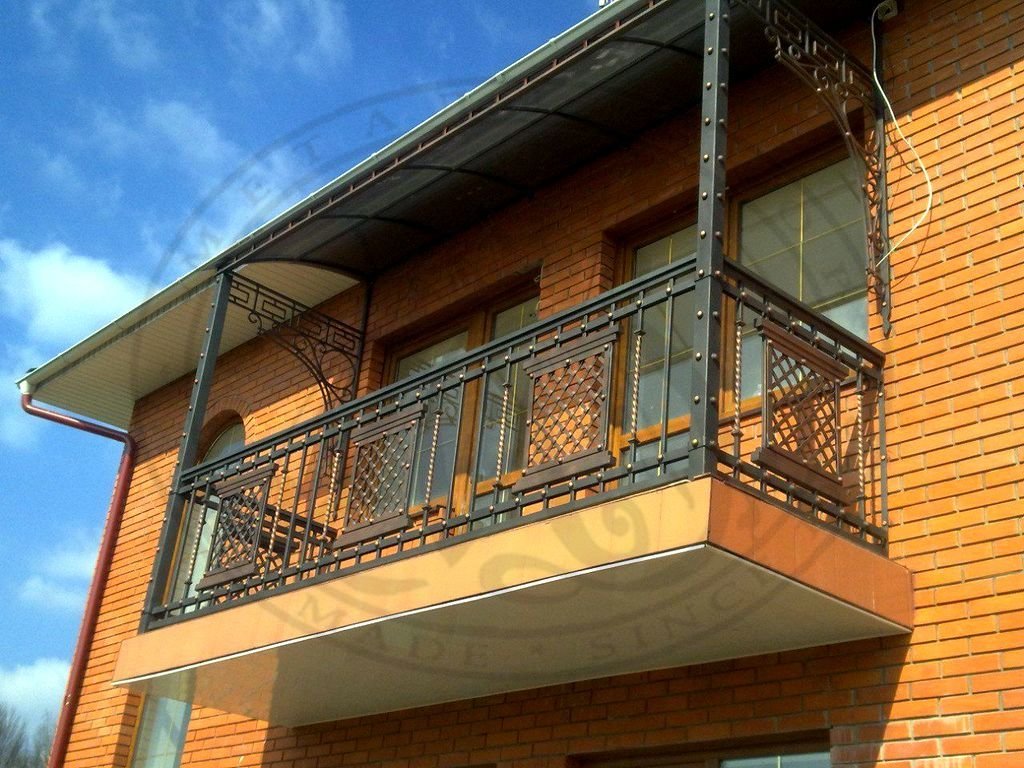 Acero laminado - refuerzo cuadrado de 10 mm, tubo profesional de 2-3 cm y / o listón de 5x40 mm. Este es un estándar que es mejor cumplir: los valores más bajos conducirán a una menor resistencia y la estructura pronto se doblará, los grandes agregarán masa adicional a la losa del balcón, que es posible que no pueda soportar. La ventaja de un parapeto soldado es dar una estructura de cualquier forma, resistencia a cargas importantes. El metal soldado hace juego con una casa de madera. Independientemente del tipo de construcción, las cercas de acero son las más resistentes y fiables. Puede ser pintado o anodizado - cubierto, por ejemplo, con una capa de zinc o níquel.
