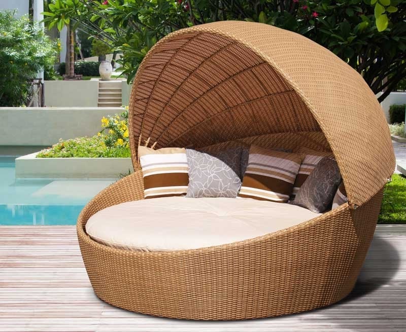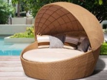 Entre la amplia gama de materiales para la fabricación, también puedes encontrar ratán. Los modelos de ratán se eligen generalmente para casas de verano, a menudo se instalan en las calles, especialmente las versiones semicirculares con un dosel.