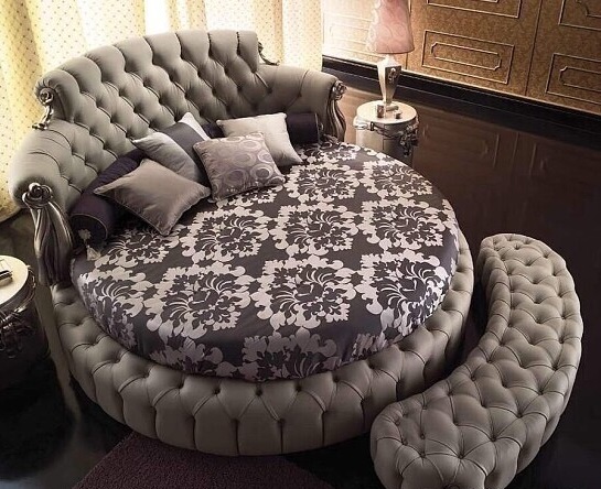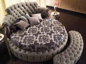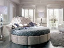 - También recomendamos echar un vistazo más de cerca a la gran cama redonda gris con un diseño de atadura de carruaje. Este modelo tiene un cabecero alto, que armoniza muy bien con un banco semicircular ubicado cerca de la cama.