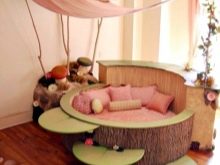 - Los modelos de camas, completamente tapizados con textiles rosas, son elegidos con mayor frecuencia por los padres para habitaciones de niñas pequeñas. Para complementar el diseño original, generalmente se utilizan almohadas decorativas y hermosas colchas de una variedad de materiales.