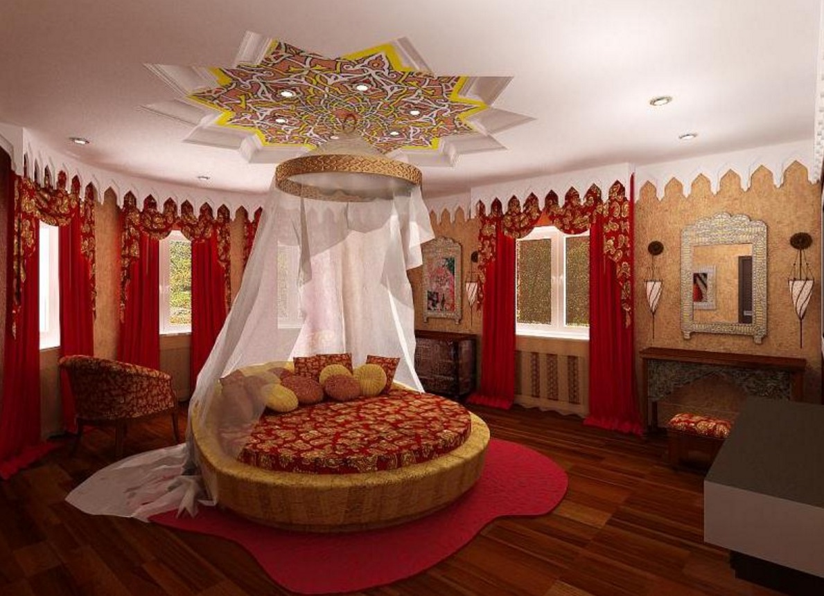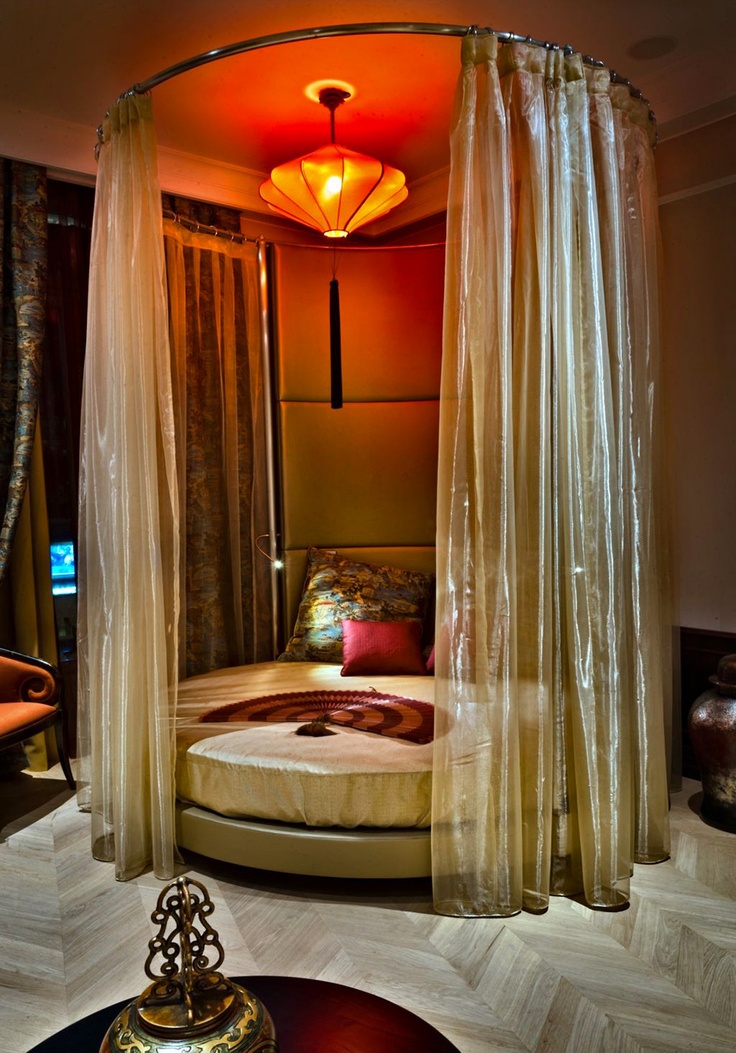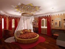 - En estilo oriental, las camas redondas están hechas con un cabecero alto, que consta de varias partes. Dichas copias están enfundadas con textiles con una impresión original, por ejemplo, monogramas o flores, y a menudo también están decoradas con cuero. Se prefieren los colores cálidos, así como los tonos marrones, dorados, arena y algunos otros.