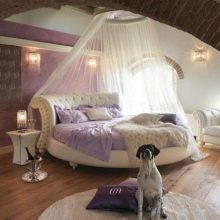 - Una cama redonda con dosel se ve muy elegante en un interior clásico. Los colores más ventajosos para la tapicería son todos los tonos claros, incluidos el blanco, lechoso y crema, teniendo en cuenta el hecho de que el interior está realizado en colores pastel.