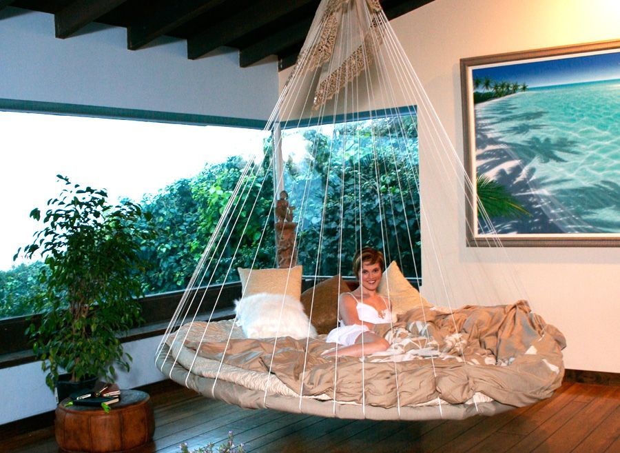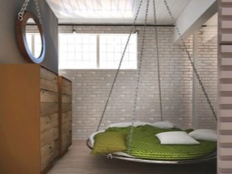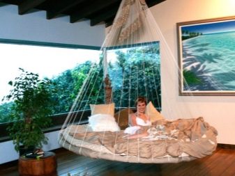 También hay un diseño de cama redonda colgante. Por lo general, esta opción es la más adecuada para elegir una casa privada, donde se puede proporcionar una gran cantidad de espacio libre en el dormitorio.
