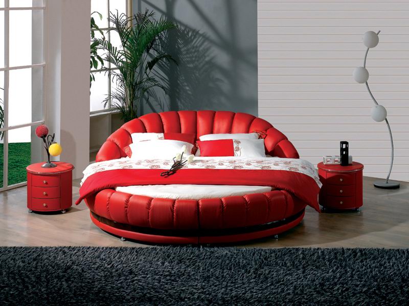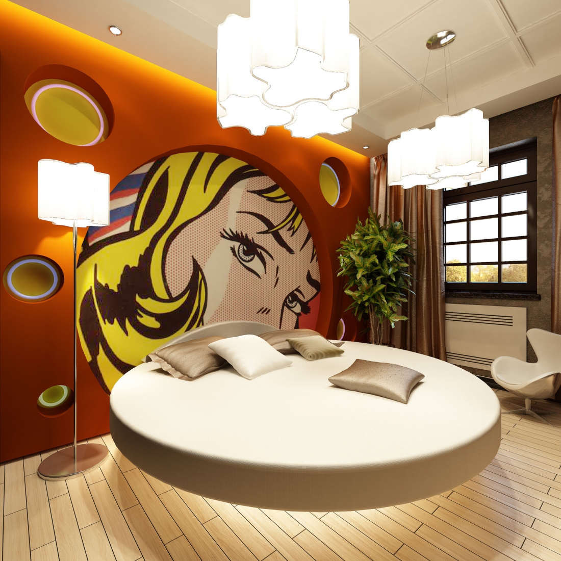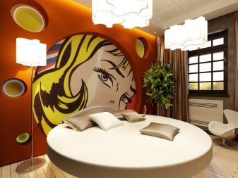 - Para un estilo de interior como el pop art, se puede considerar como un modelo blanco., y un lecho de un rico tono rojo. Esta tendencia se caracteriza por el uso de colores brillantes, lo que significa que no debes tener miedo de experimentar con revestimientos de paredes y textiles. Una excelente adición a una cama redonda puede ser una pared pintada a mano al estilo del arte pop o un panel original ubicado justo detrás de la cama.