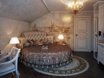 - Hoy en día, muchas personas exitosas eligen un estilo como el neoclásico para decorar sus dormitorios. No es más que una combinación de elementos clásicos con elementos modernos. Una cama de este estilo también se puede instalar redonda, sin embargo, para darle más originalidad a la habitación y enfatizar el estilo, vale la pena considerar opciones con formas o elementos decorativos aún más inusuales.