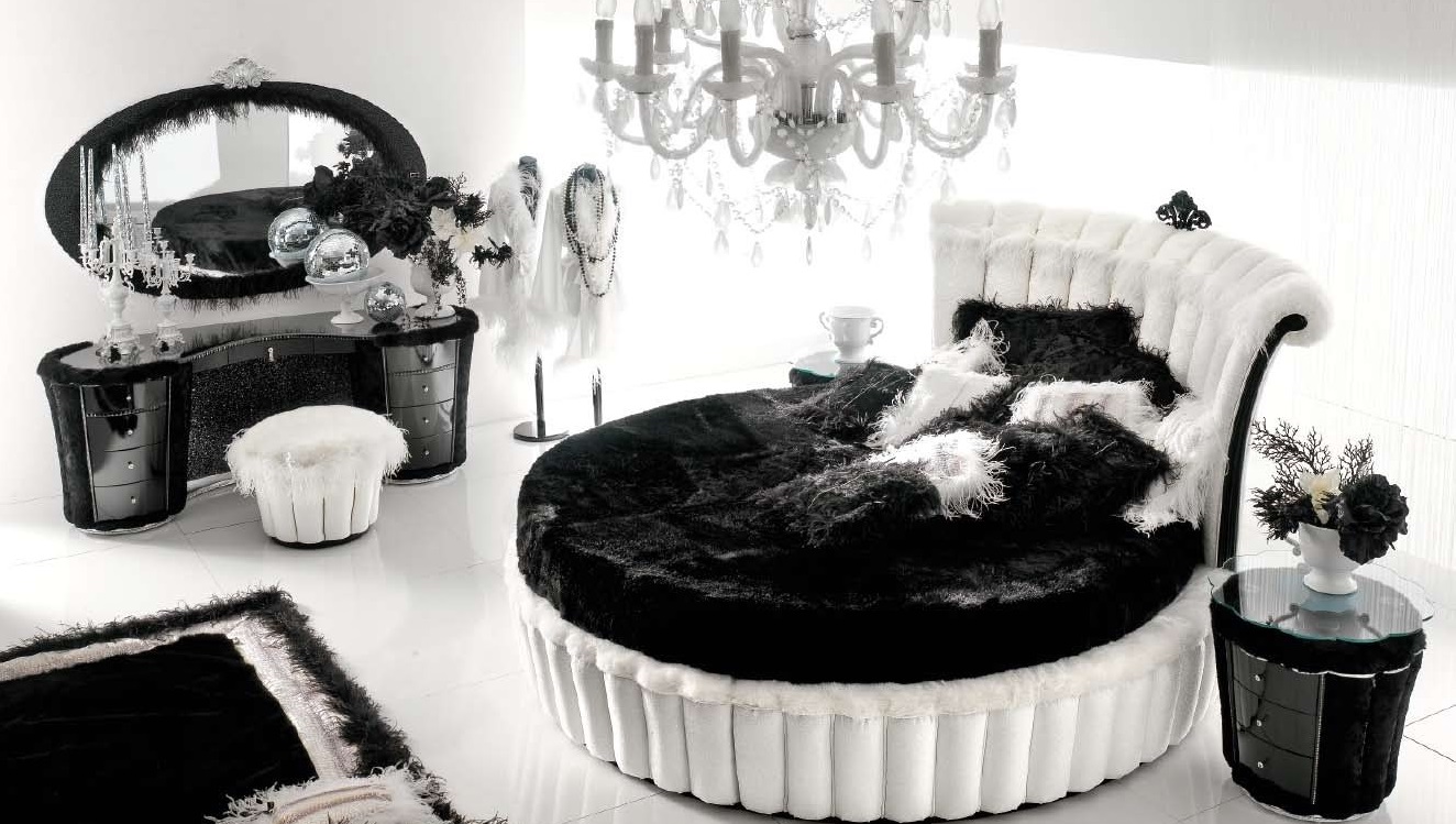 - Para un dormitorio en blanco y negro, puede comprar un modelo de cama redonda con cabecera alta., el modelo con tapizado textil blanco se verá especialmente ventajoso. Para acentuar el área de dormir, puede decorarla con cojines blancos y negros y una colcha oscura. También es recomendable elegir mesitas de noche semicirculares, por ejemplo, de color negro intenso.