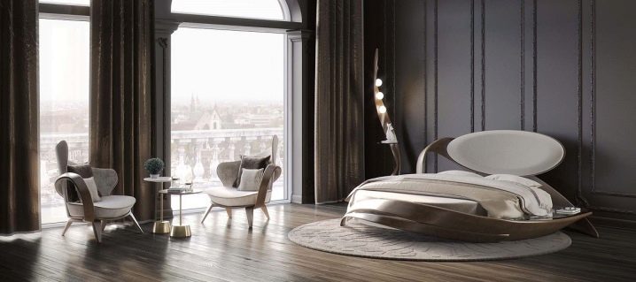Si no está seguro de poder desarrollar de forma independiente el interior de un dormitorio con una cama de este tipo, es mejor consultar a un especialista o dar preferencia al modelo rectangular clásico.