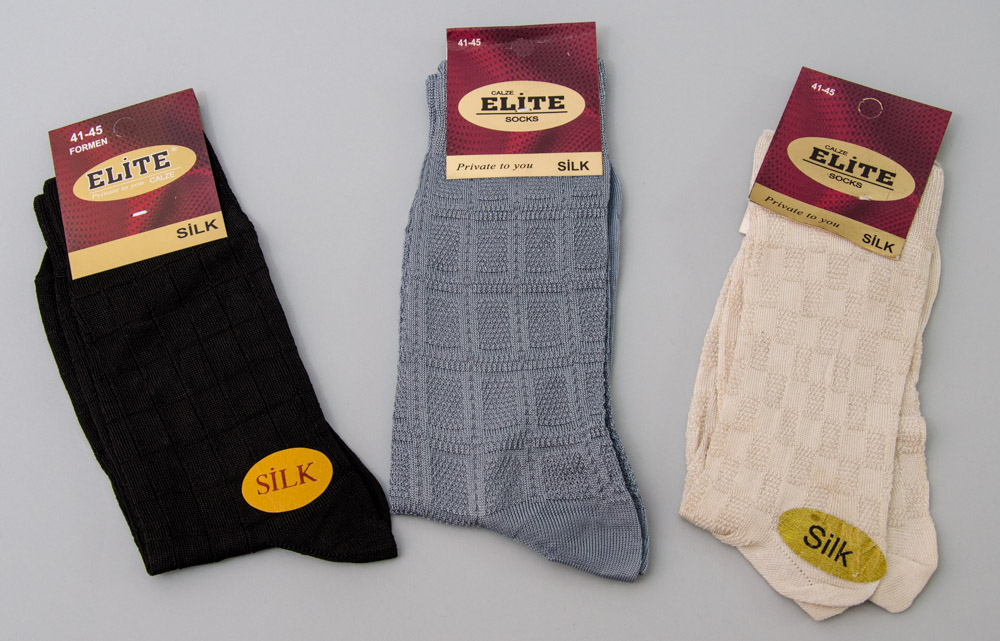- Seda - material blando, pero muy duradero y más caro en comparación con otros materiales. Los hilos de seda añadidos al algodón le darán fuerza al producto y aumentarán la resistencia al desgaste. Calcetines de seda: una variante de un producto para salir, para ocasiones especiales, para unas vacaciones.