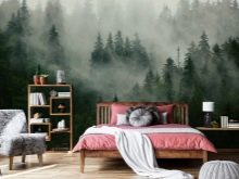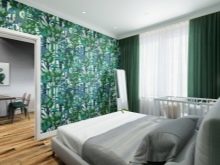 - Una verdadera guarida, acogedora, cálida, que protege de todo. El papel tapiz es como un denso bosque en el que se encuentra esta guarida. Una habitación pequeña cambia visualmente su geometría con tales soluciones de diseño.