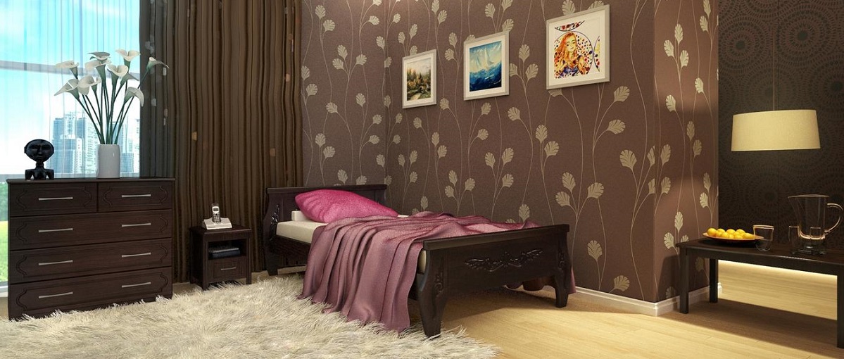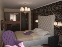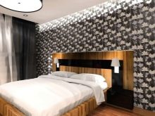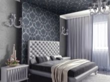 Los muebles claros, livianos y simples en combinación con papel tapiz oscuro pueden brindar combinaciones inesperadamente agradables que hacen que la habitación sea visualmente más acogedora y aireada. Pero una cama oscura masiva con una cabecera voluminosa, y sobre el fondo de un papel tapiz oscuro y profundo, puede crear una sensación de congestión, como resultado de lo cual será aún más difícil conciliar el sueño en una habitación así.