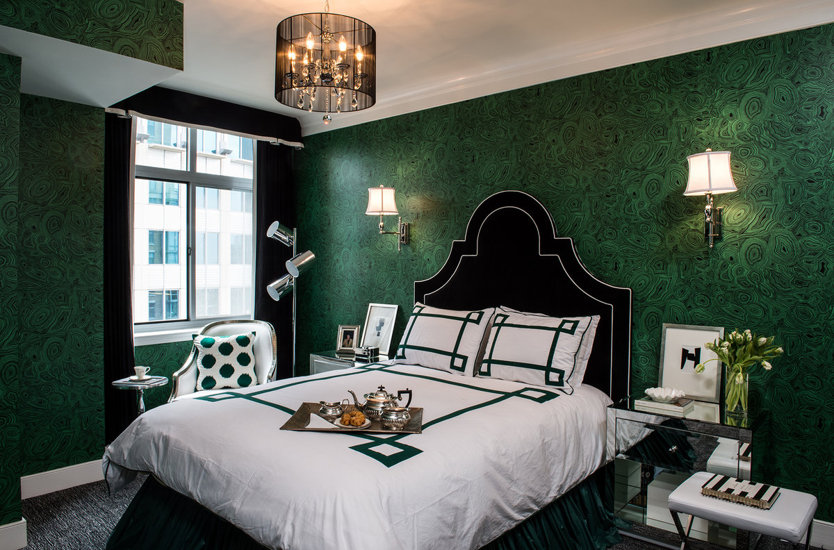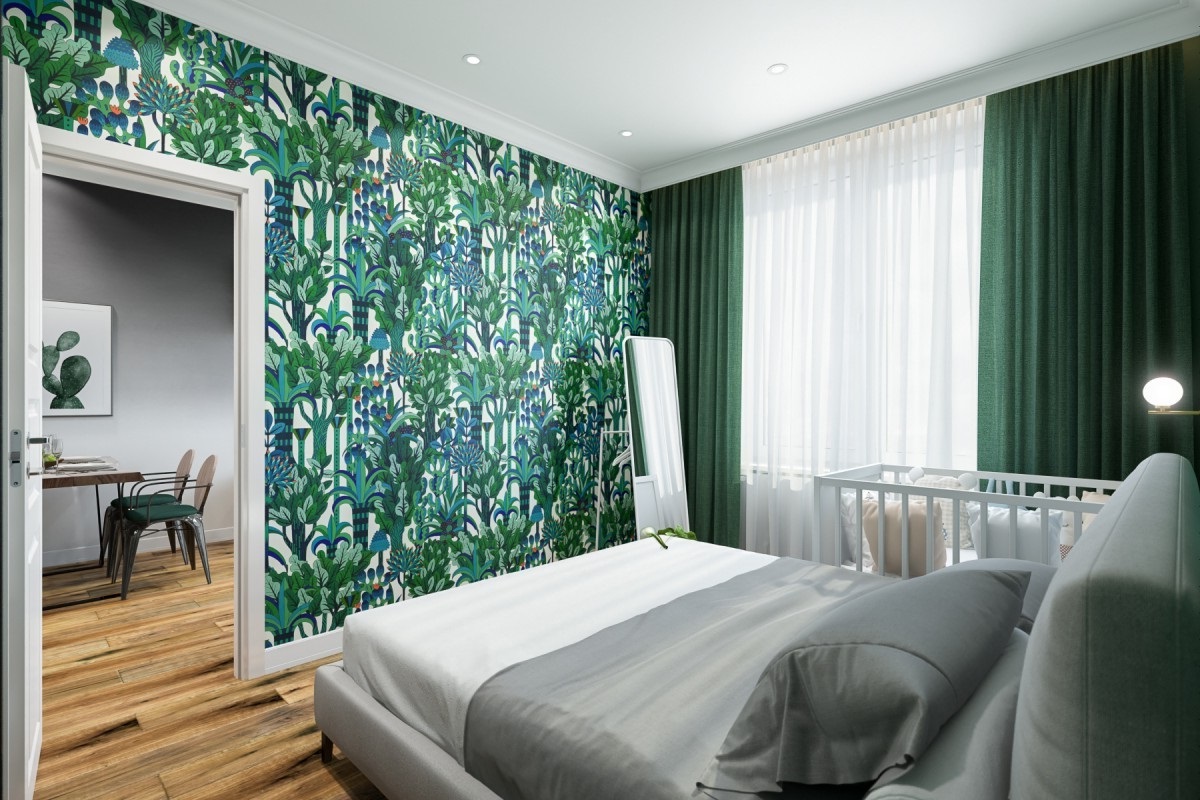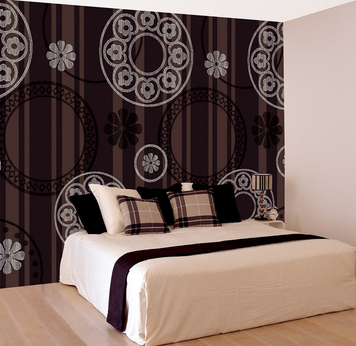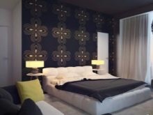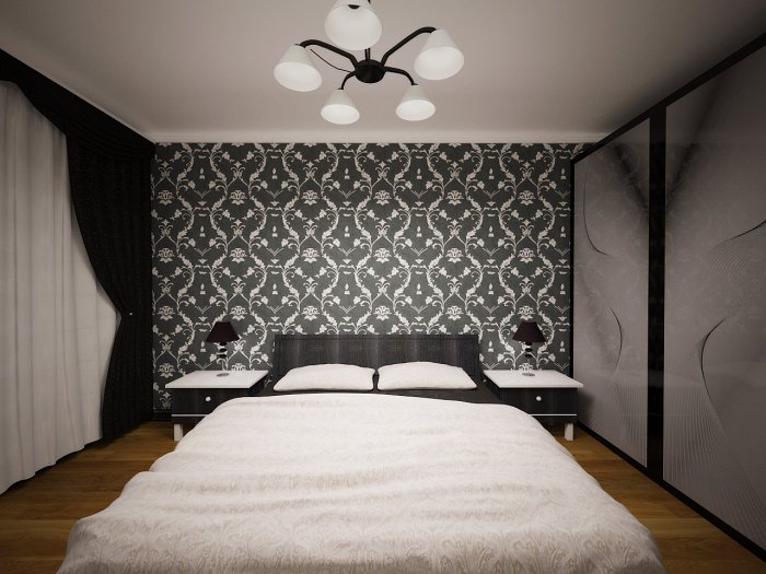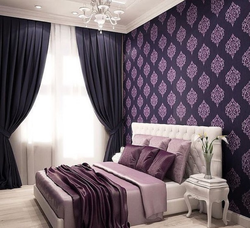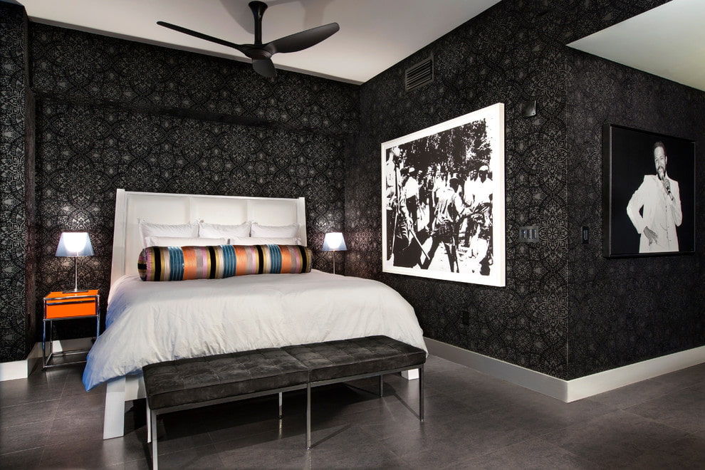 Papel tapiz oscuro en el interior del dormitorio.