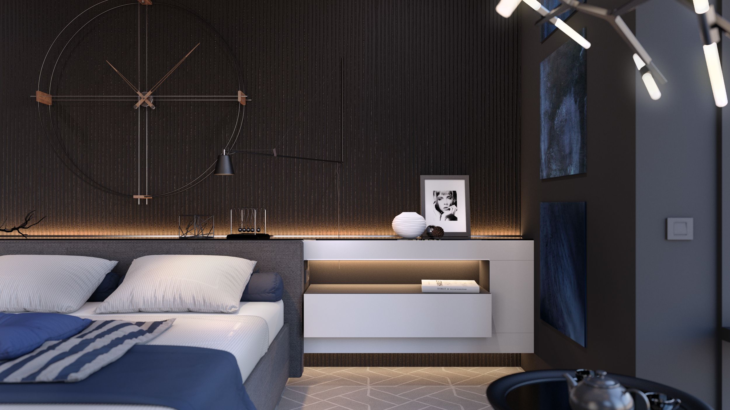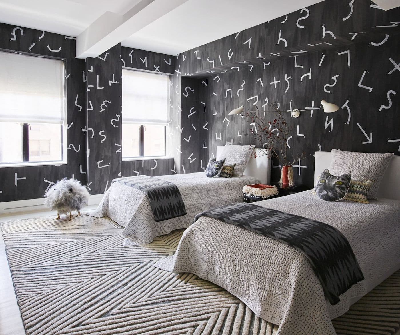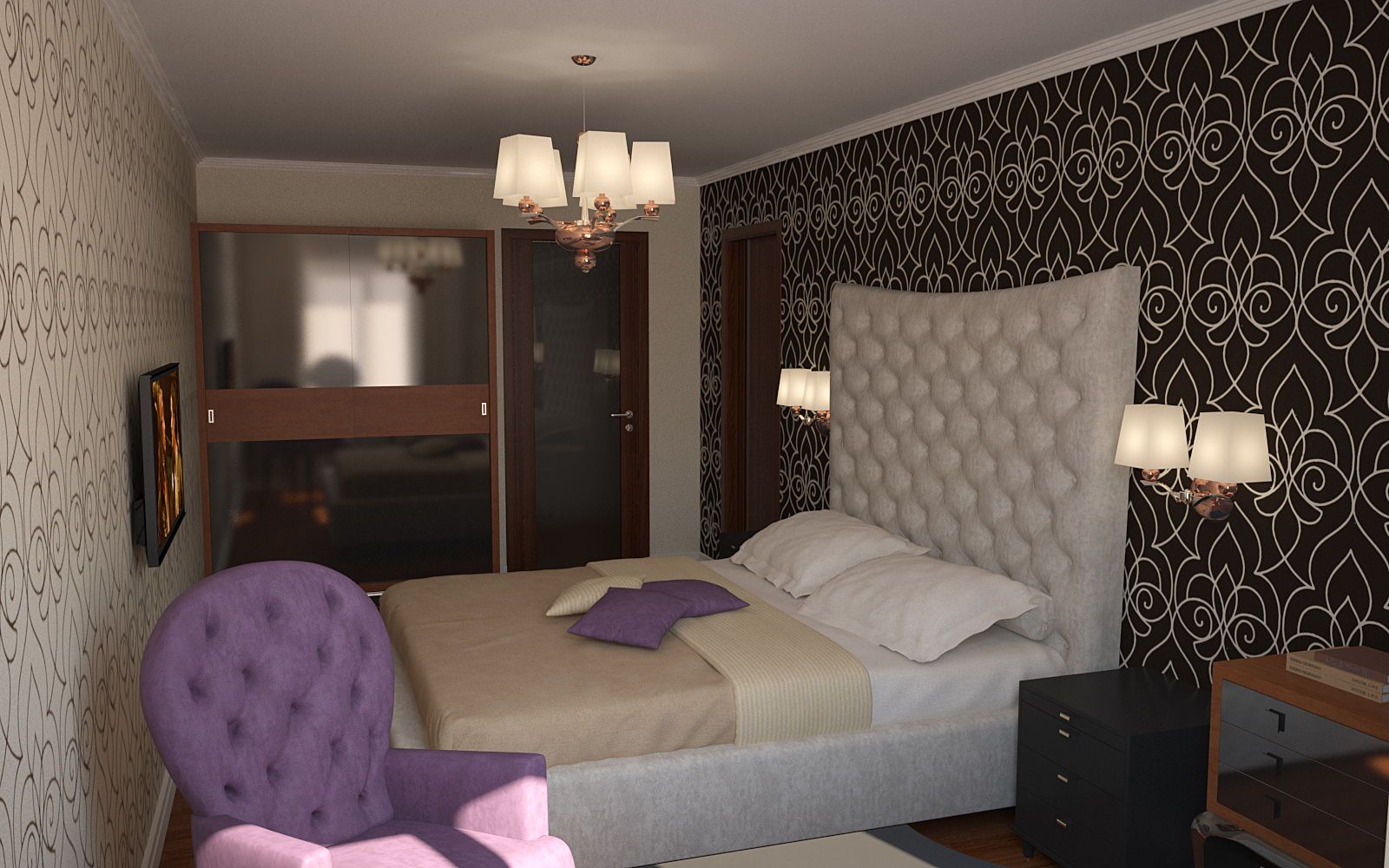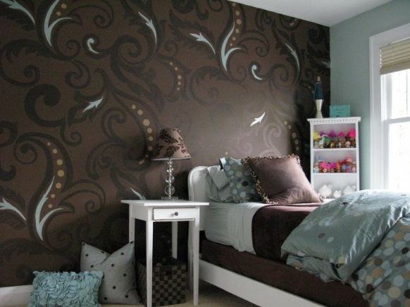 Papel tapiz oscuro en el interior del dormitorio.