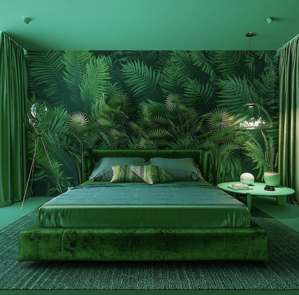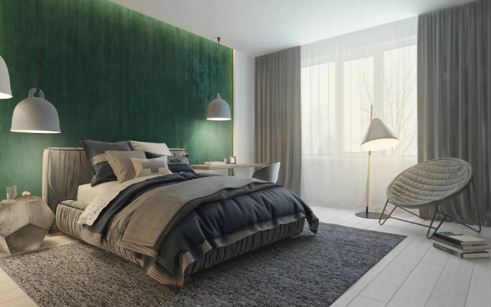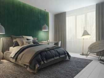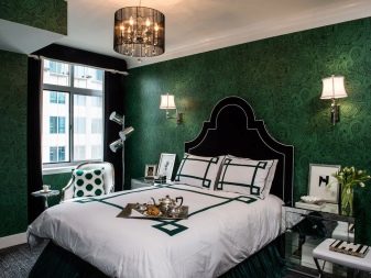 El color se asocia principalmente con la naturaleza, la frescura, la naturalidad. Y las personas que lo aprecian pueden hacer que las paredes del dormitorio sean de color verde oscuro. Este es un esquema de color agradable, que es bueno incluso a nivel fisiológico; se cree que alivia e incluso es capaz de normalizar la presión arterial hasta cierto punto.