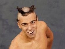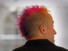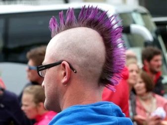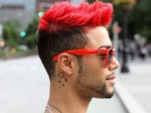 Uno de estos fanáticos de los colores brillantes se decidió por un peinado muy extravagante. Hacer un mohawk no fue suficiente para él. El tipo decidió convertirlo en un verdadero lagarto. Para hacer esto, era necesario afeitar con cuidado parte del cabello, formando las patas, y colocar el resto del flequillo para que el lagarto tuviera cabeza. Puede complementar el estilo creativo con un color de color con horquillas en forma de ojos anfibios.La criatura de color se ve divertida y atractiva al mismo tiempo.