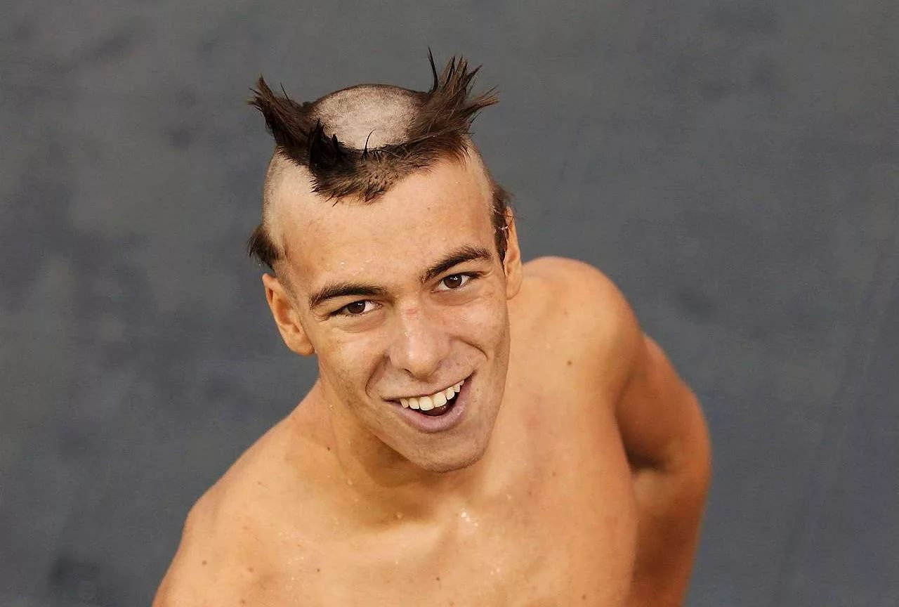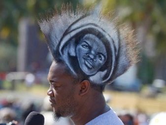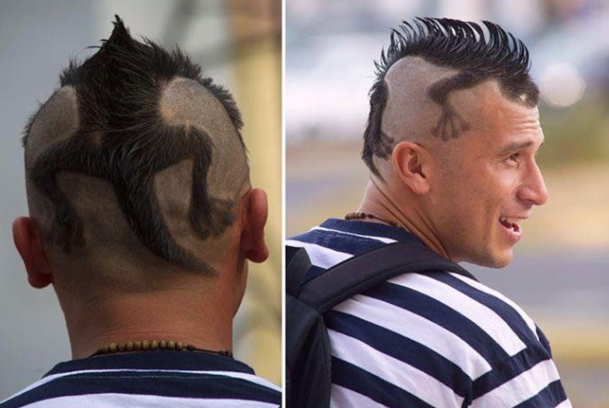 Debido a su popularidad, muchos informales querían imitar su estilo, por lo que copiaron el peinado. Y se ve muy inusual: el pelo no se rapa en los lados, lo que es más habitual para muchos, sino en la mitad de la cabeza. A los lados, las hebras están pintadas. La mayor parte es verde. Los tonos azules y rosas complementan el peinado. Con su peinado, y en general, el hombre se parece al Joker, un famoso villano de los cómics de superhéroes sobre Batman.