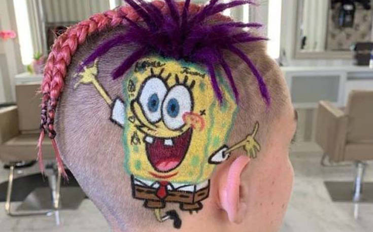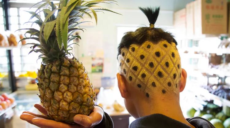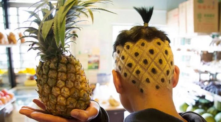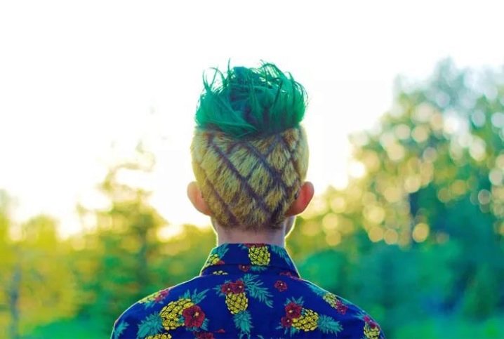 La mayor parte del cabello está corto. Los patrones afeitados le dan al peinado una similitud con una fruta tropical. Y en la parte superior de la cabeza, se dejó un mechón de cabello especialmente, teñido de verde. Debe simbolizar las mismas hojas de piña. Todo parece muy impresionante en general.