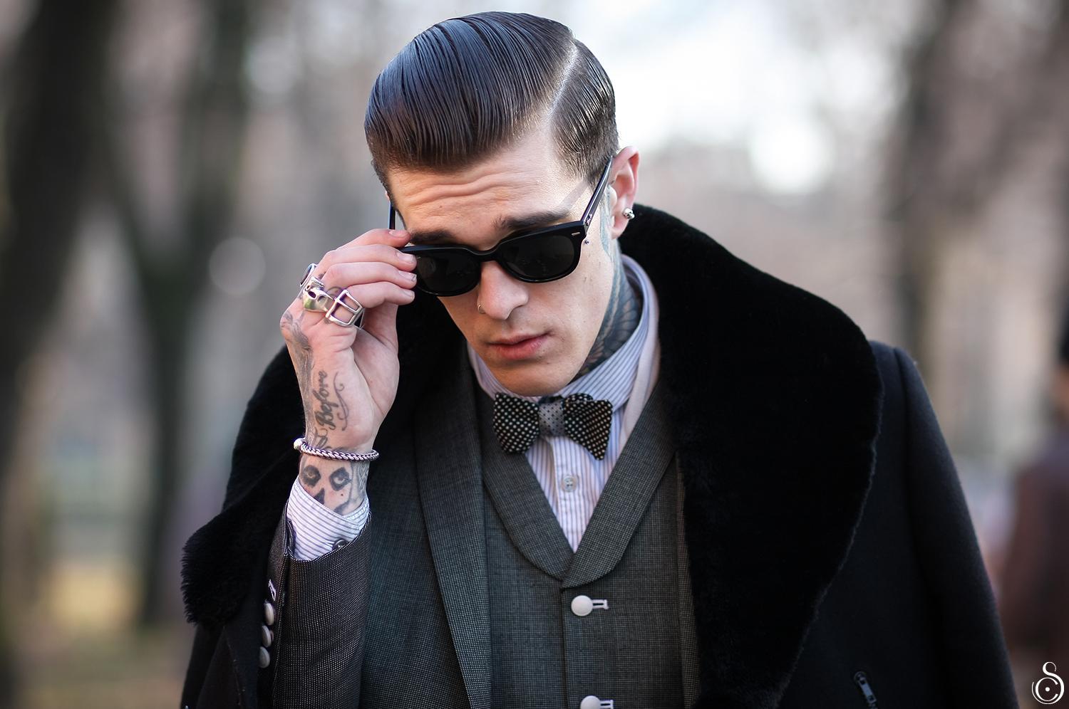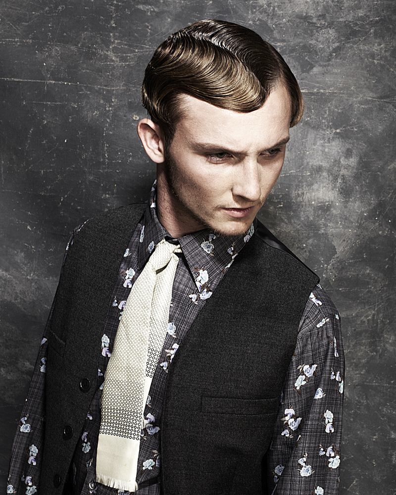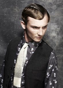 Luce creativo con cabello y peinados de longitud media en el espíritu de los gánsteres de Chicago de la primera mitad del siglo XX. En este caso, el cabello mojado se divide en una raya, se trata abundantemente con gel o grasa (la movilidad de las hebras depende de la elección del producto) y se peina con un peine fino.