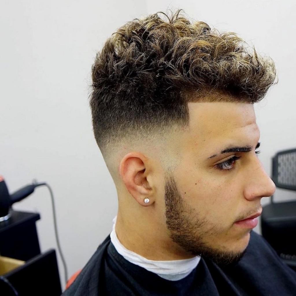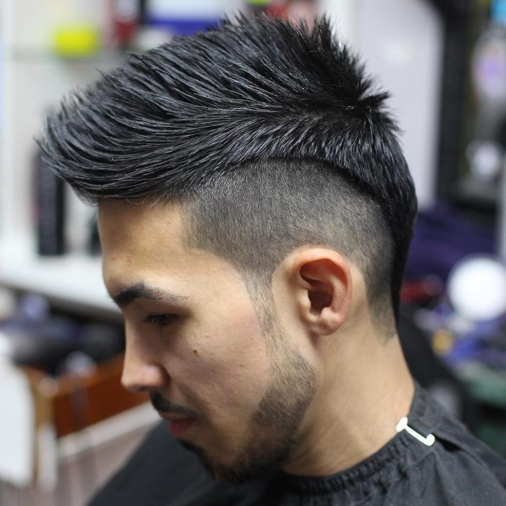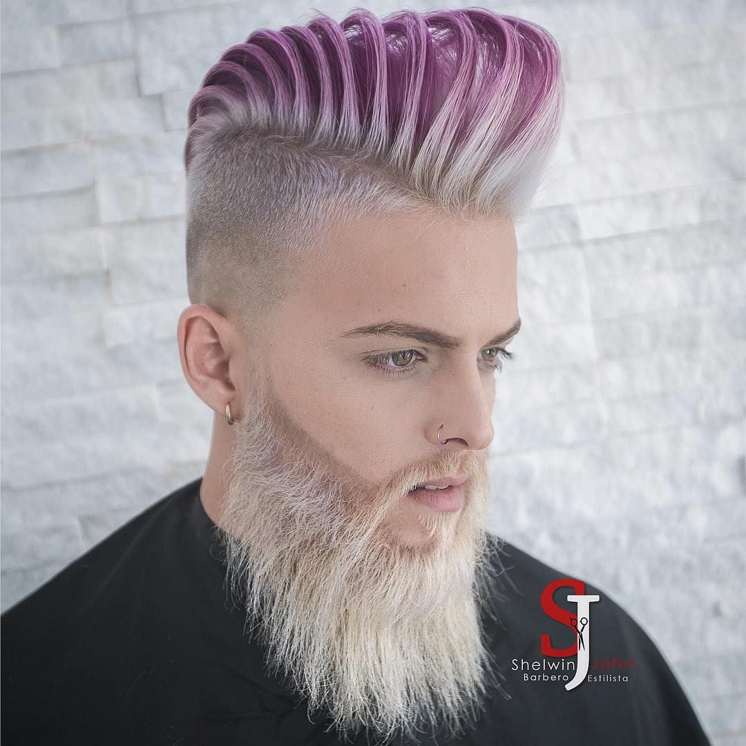 El alto desvanecimiento recuerda algo a un mohawk y se coloca fácilmente verticalmente, formando una cresta en la parte central de la cabeza. En este caso, el cabello en las sienes y la parte posterior de la cabeza está completamente afeitado, las partes laterales se cortan. El ancho de la tira de cabello restante es de aproximadamente 10 cm, la longitud de las hebras puede alcanzar los 10-15 cm. El peinado requiere cuidado, se ve bien en combinación con colores contrastantes, símbolos afeitados.