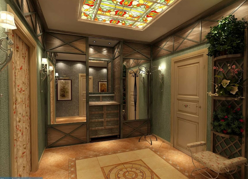 No descarte el estilo provenzal. Este pasillo está decorado en tonos lechosos, lavanda, verde claro o amarillos delicados. Ella está necesariamente decorada con flores en macetas. Al menos algunas superficies deben estar decoradas con motivos florales. Otra característica indispensable es la presencia de cosas envejecidas.