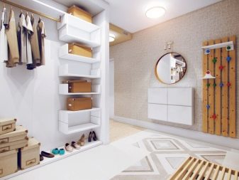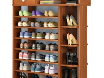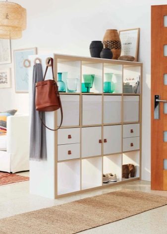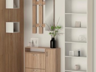 En cualquiera de estos grupos, los racks pueden ser rectos, de esquina, de espaldas a la pared, colgantes, de zonificación. Además, los diseños difieren en el propósito: zapateros, decoración, accesorios. De acuerdo con el tamaño del modelo, se producen estrechos, anchos, altos, bajos, para cualquier parámetro del pasillo.