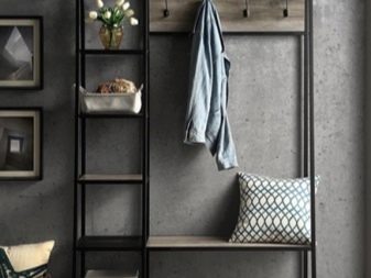 Al comprar un estante en un pasillo listo para usar, es necesario tener en cuenta el estilo existente. Por ejemplo, Los productos de metal se adaptarán a los interiores modernos en estilo loft y de alta tecnología. Los estantes de vidrio decorarán los pasillos con un estilo de fusión, minimalismo. Los modelos de madera son universales, se adaptarán a cualquier diseño.