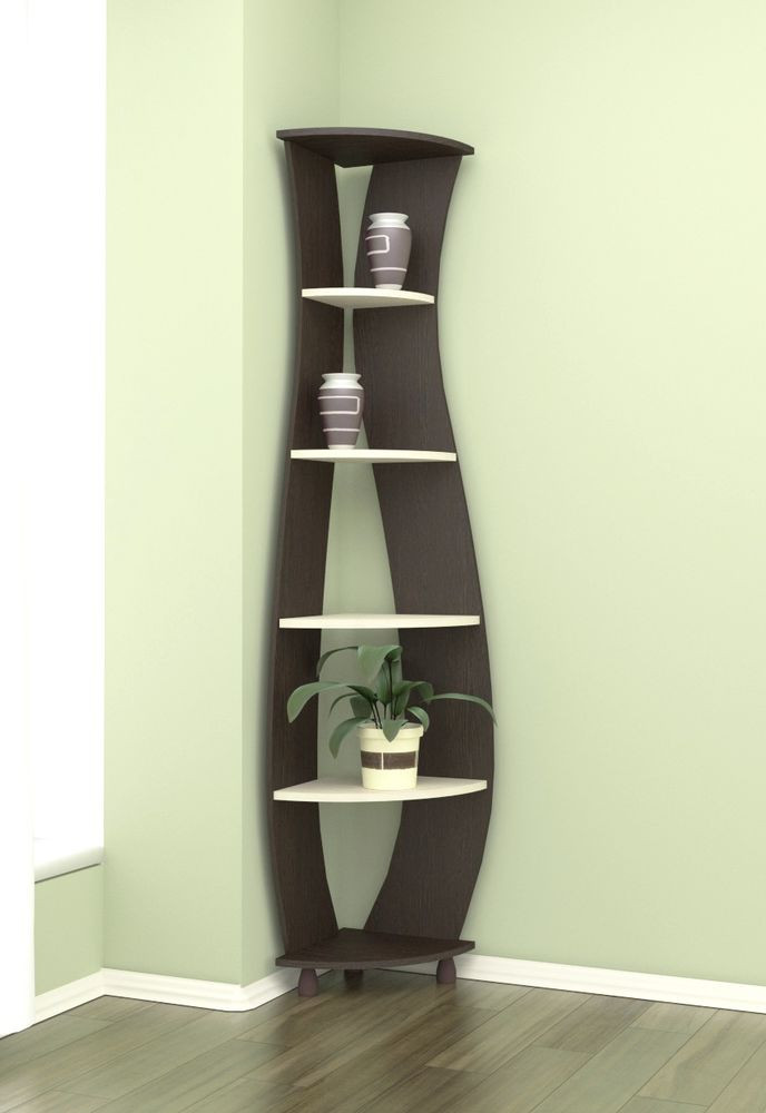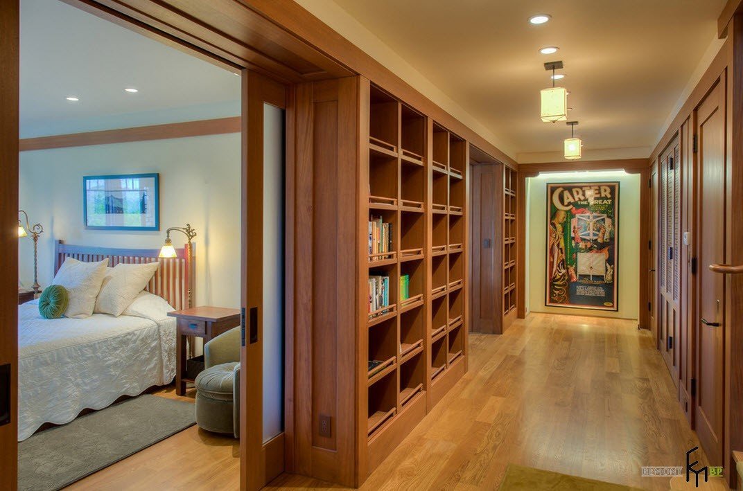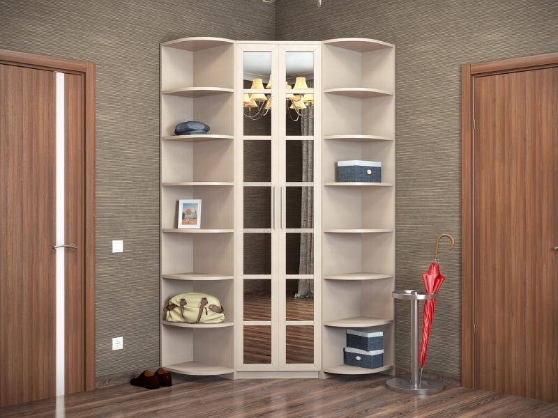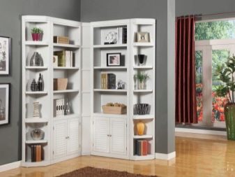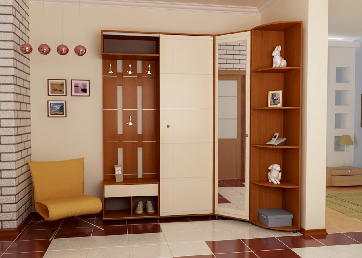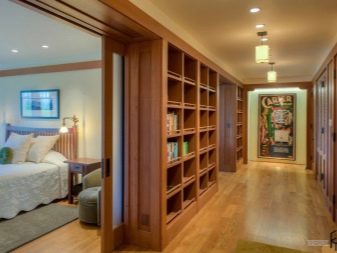Las paredes del pasillo consisten en gabinetes cerrados y pedestales, a menudo incluyen un espejo o una sección con una percha abierta. Para las estanterías en este diseño, se asigna un lugar lateral, donde los estantes se instalan rectos o en ángulo. Por ejemplo, puede colocar una estantería de esquina en la pared de un mueble.