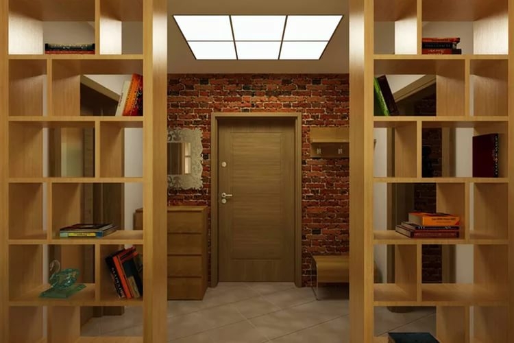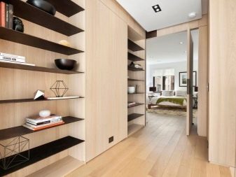 Los estantes estándar con una profundidad de estante de 20 o 30 cm generalmente se compran en el pasillo. En habitaciones compactas, puede utilizar productos estrechos colocándolos, por ejemplo, a ambos lados del arco que conduce a la sala de estar.