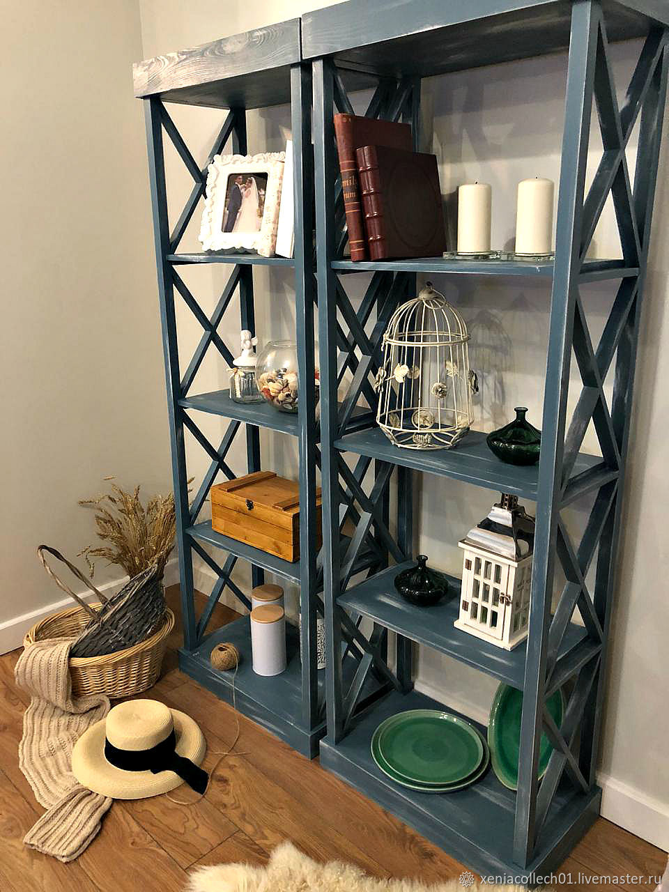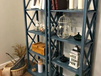 El estante tiene lados y estantes abiertos. Si tiene un tamaño de piso a techo, se fija a la pared para mayor estabilidad. Las pequeñas estructuras móviles se instalan libremente, si se desea, se pueden reorganizar.