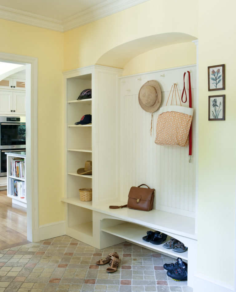 - un diseño práctico en la entrada contiene todo lo que necesita: estantes abiertos, perchas, un espejo y un gabinete con asiento;