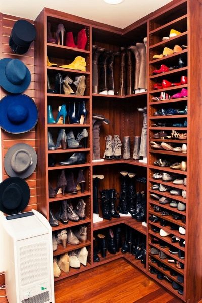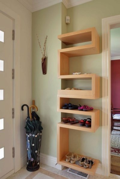 - los zapatos nuevos se ven bien en los estantes abiertos, las botas y los zapatos gastados crean una apariencia aburrida y no se reflejan de la mejor manera en la atmósfera del pasillo.