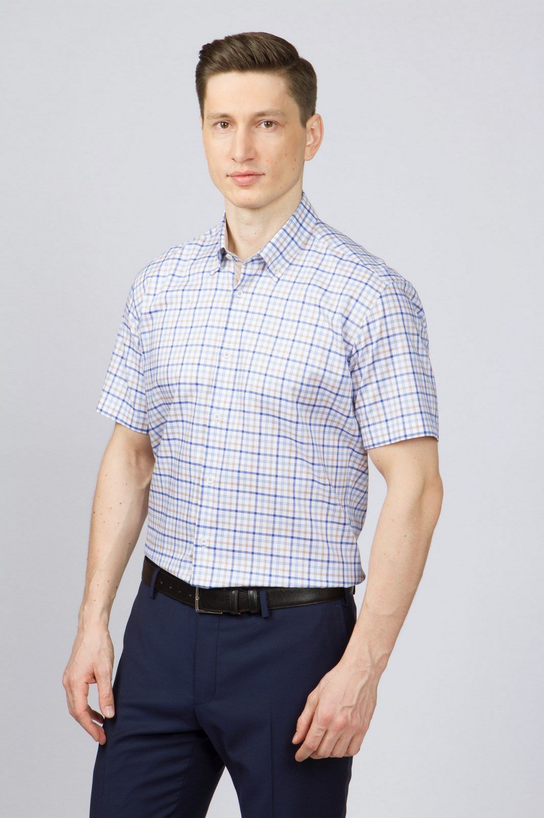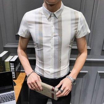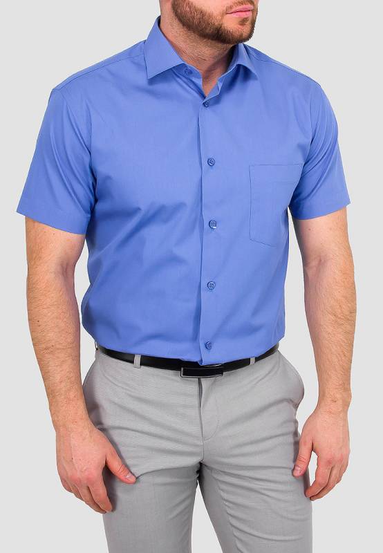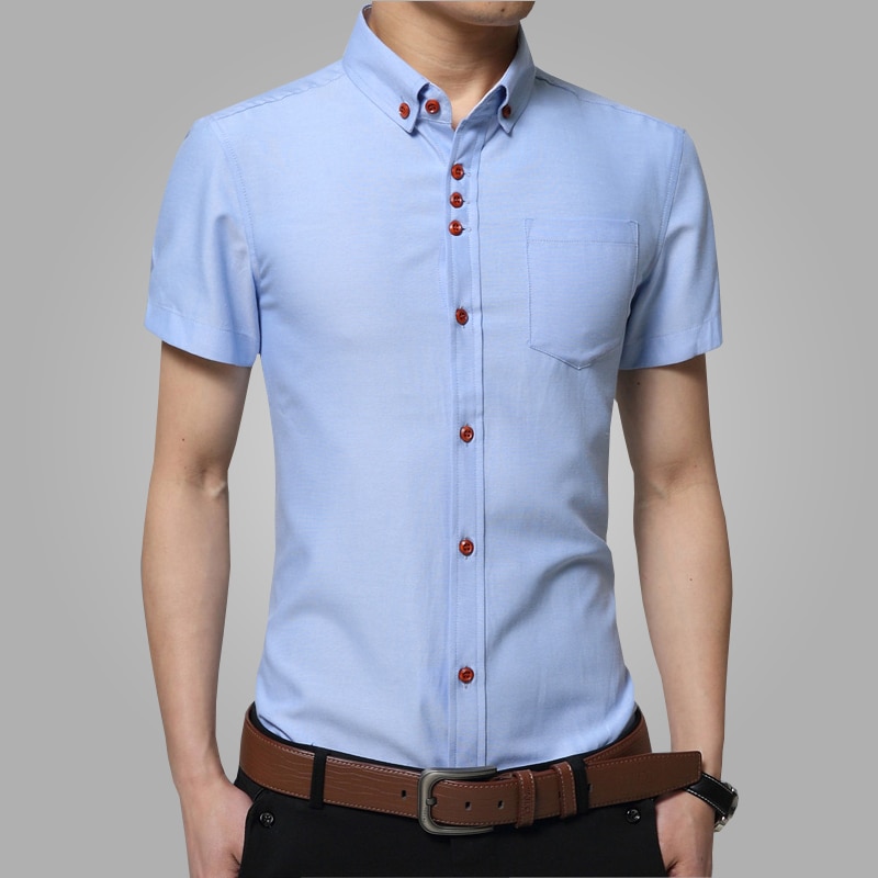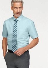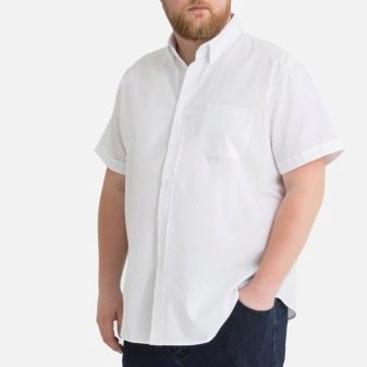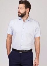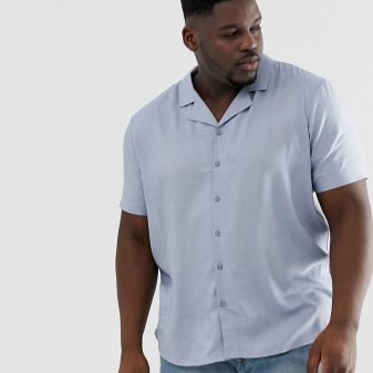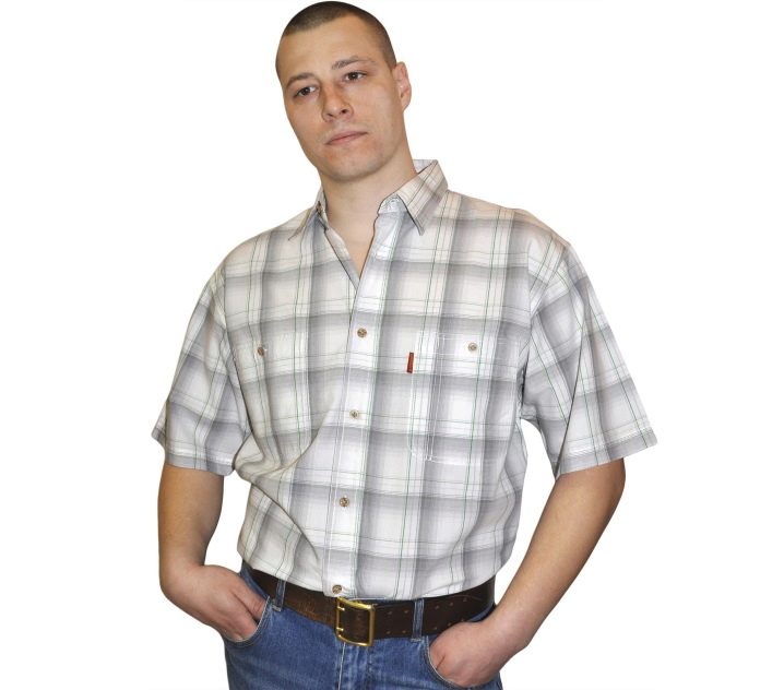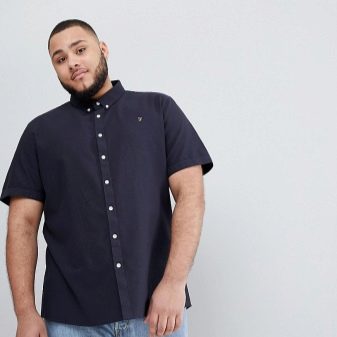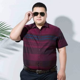 Los tamaños grandes sugieren personas grandes. Para los hombres altos con sobrepeso que se ven obligados a adherirse a un estilo de negocios en el trabajo en la congestión del verano, una camisa recta con mangas cortas hecha de material natural liviano sería una buena opción. La longitud del producto no debe ser corta, cortando visualmente la figura.