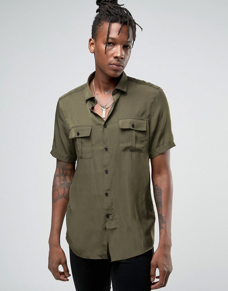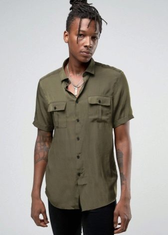 - Militar - Las camisas tienen elementos contrastantes: botones y correas de sujeción, puños, puños, tirantes. Ha aparecido una camisa de color liso con cremallera, ya que la cremallera en sí es un detalle brillante. La combinación de colores es lacónica y tranquila: caqui, marrón, gris y negro.