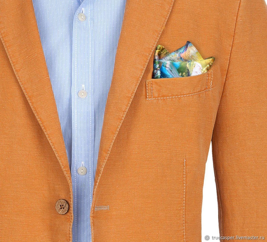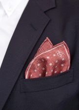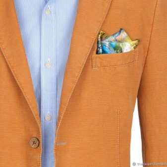 Puede elegir cualquier material para un pectoral, siempre que sea bastante fino. Si la tela es demasiado gruesa, es inconveniente doblar la bufanda y guardarla en un bolsillo. Si lo hace, el bolsillo sobresale de una manera fea, lo que arruina enormemente toda la imagen. Los materiales como el algodón, la seda, la lana y el lino se utilizan comúnmente para crear pañuelos de bolsillo para hombres.