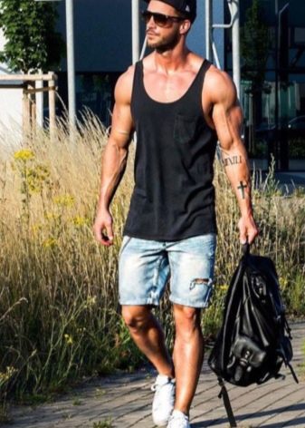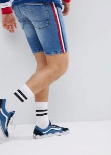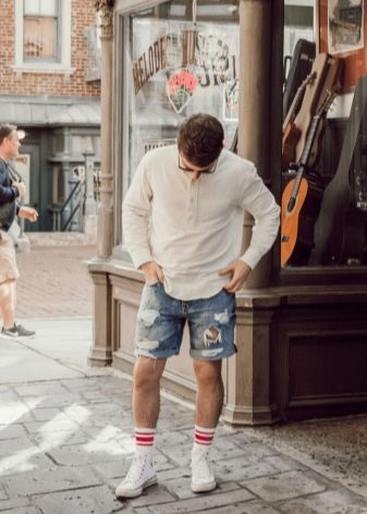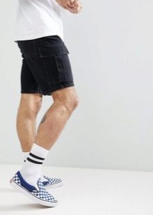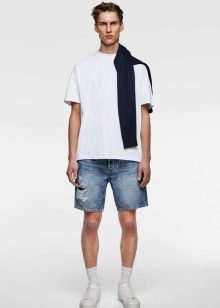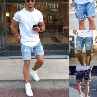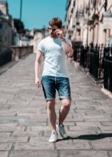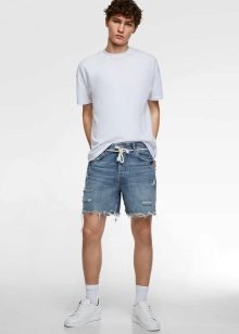 Los hombres aprecian los pantalones cortos de mezclilla por su versatilidad y practicidad, conveniencia. Los pantalones cortos de mezclilla para hombres son prendas sin pretensiones que se pueden combinar fácilmente con diferentes elementos de vestuario: camisetas, camisas de verano, camisetas. No es difícil elegir zapatos: tanto los zapatos deportivos como las zapatillas son adecuados. Es esta sencillez lo que seduce a la mayoría de los hombres a los que no les gusta reflexionar mucho sobre la creación de lazos.