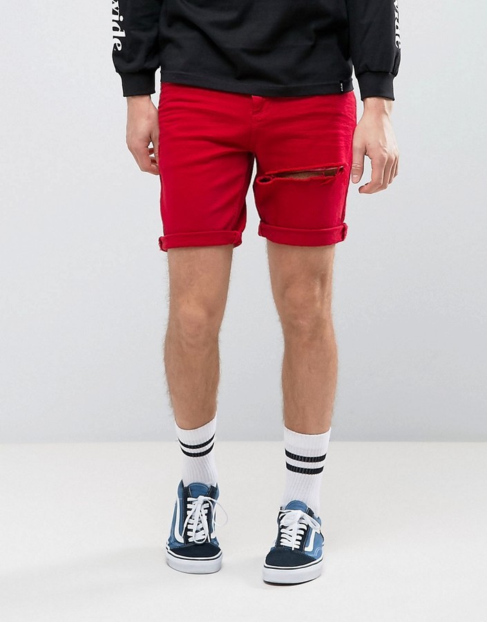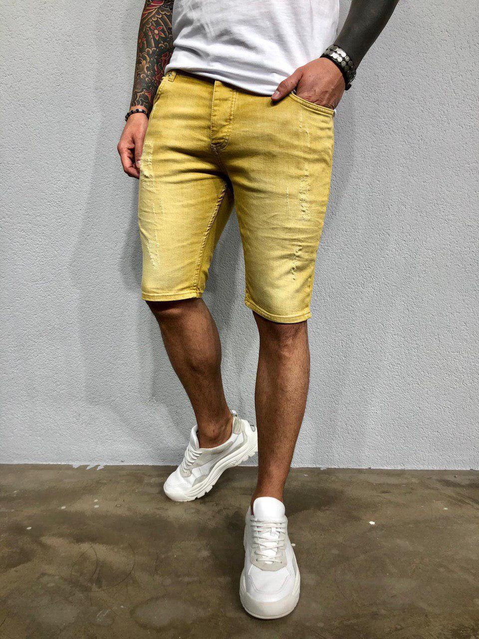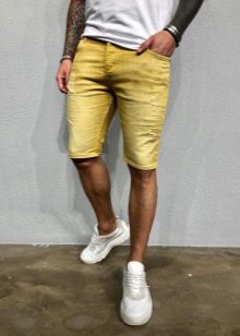 Shorts de mezclilla rojos, amarillos y grises - opciones para los valientes de espíritu y de cuerpo. Siguiendo la moda femenina de jeans de colores, se ven motivos similares en la moda masculina.