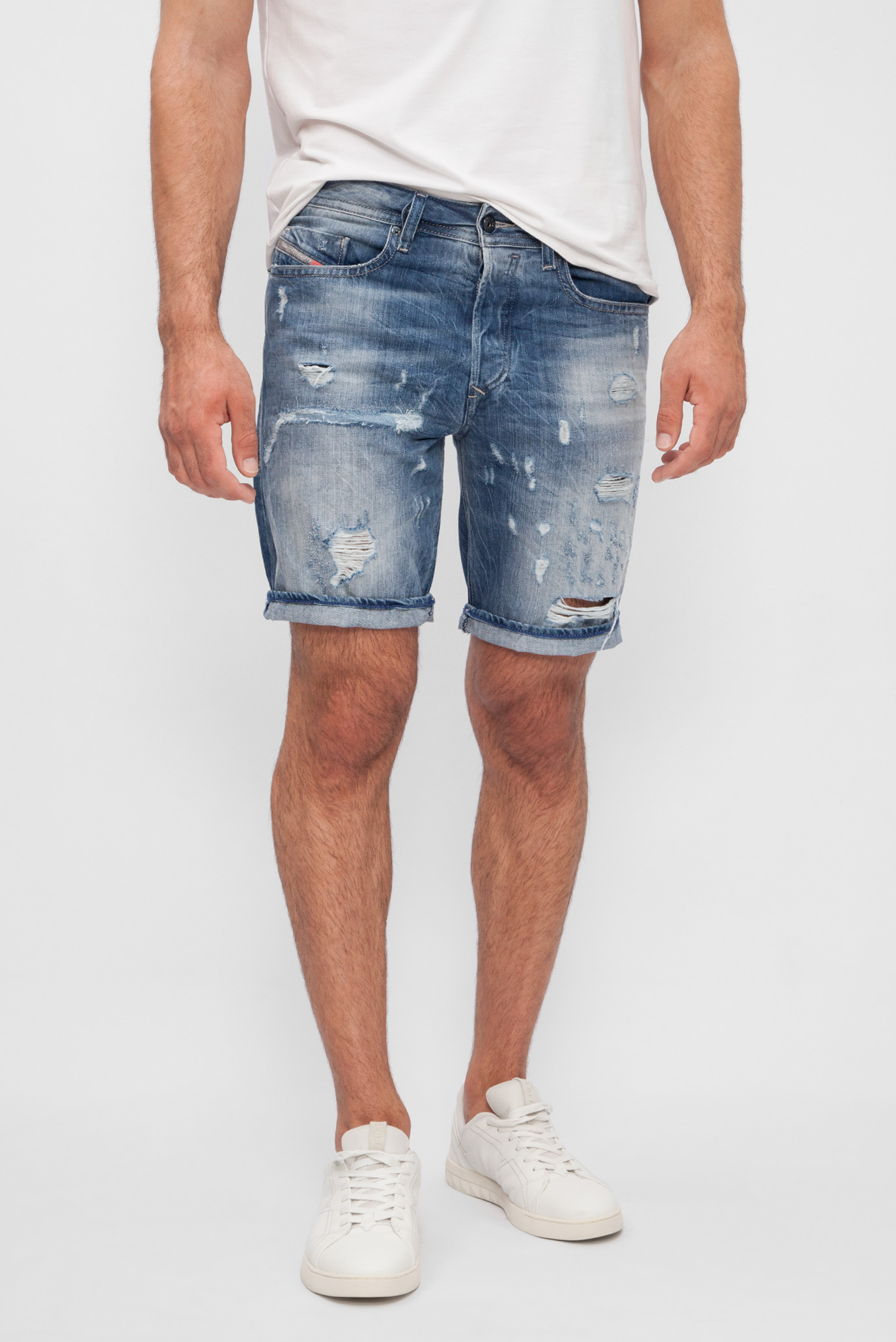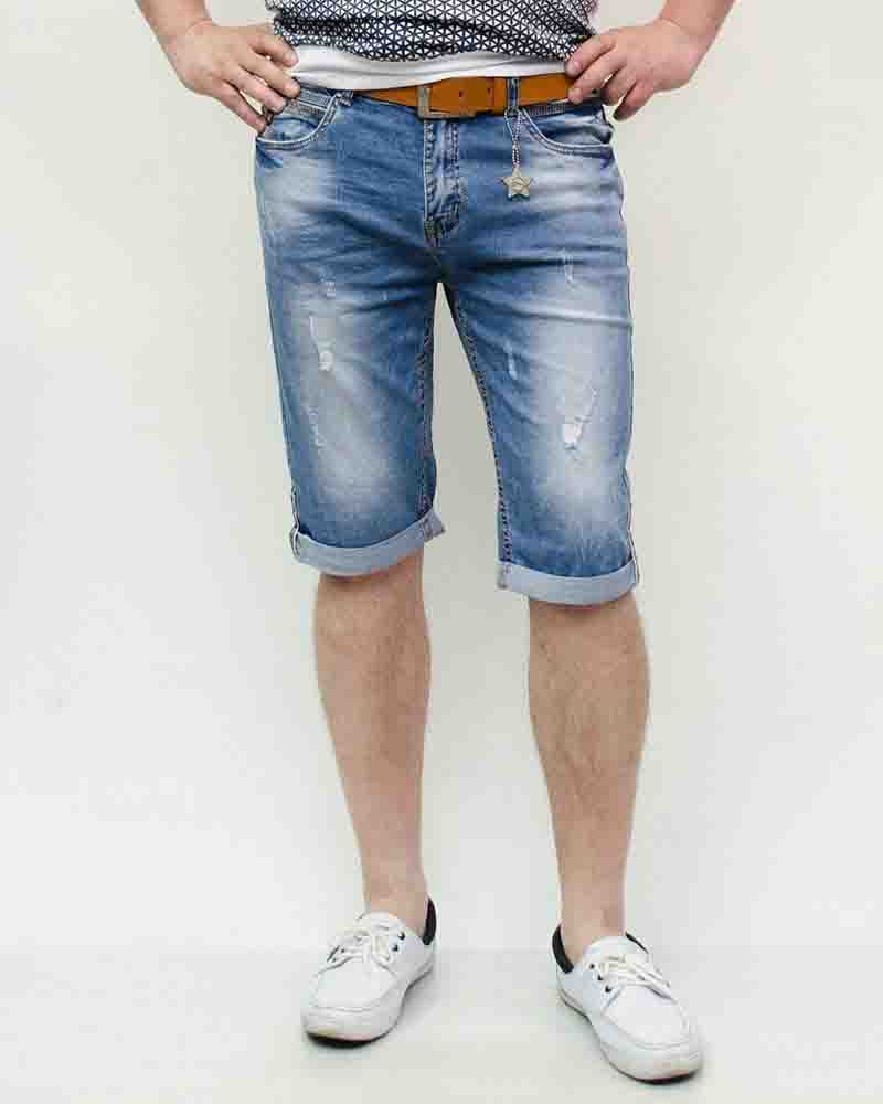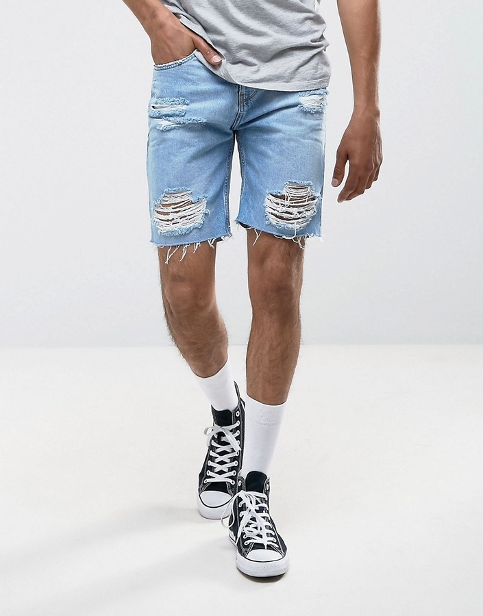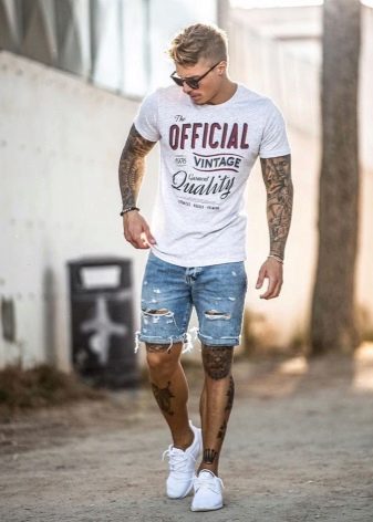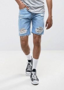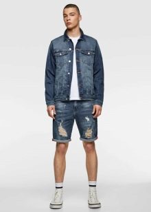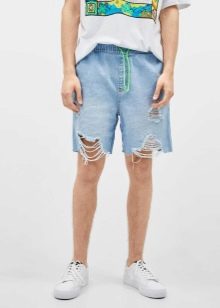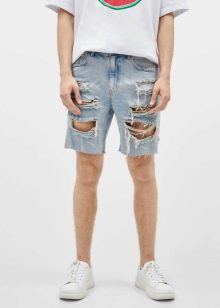Las mujeres fueron las primeras en rasgarse la mezclilla. Pero los representantes del sexo más fuerte los siguieron. Es por eso Los pantalones cortos de mezclilla rotos no han perdido su posición de moda durante varias décadas. Los agujeros pueden ser de diferentes tamaños, pueden ubicarse solo a lo largo del borde o afectar las áreas principales.