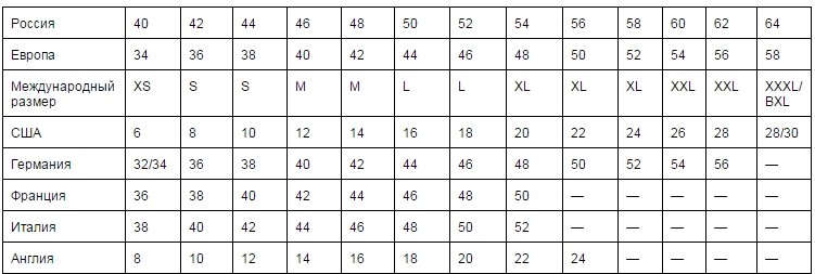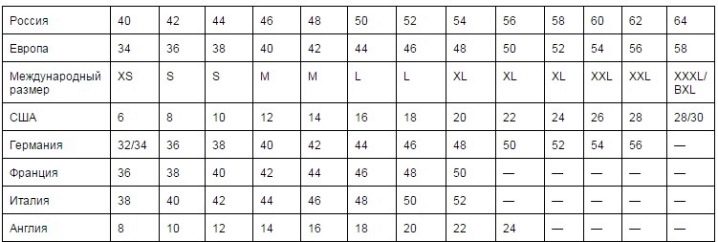 La correspondencia de tamaños rusos e internacionales se puede encontrar en la tabla.