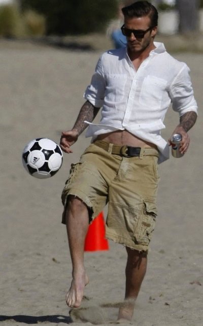 El futbolista David Beckham prefiere las opciones de mezclilla beige y claro, combinándolas con camisetas deportivas, zapatillas de deporte y, a veces, una pelota. Un hallazgo interesante de David - pantalones cortos de mezclilla con camiseta blanca - alcohólico ”, aunque en su tierra no se le llama así.