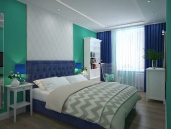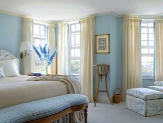 Azul y azul. Dichos papeles pintados le darán frescura a la habitación, la convertirán en un lugar acogedor para relajarse. Aquí es mejor dar preferencia a las cortinas blancas, beige, crema o amarillas. Para fondos de pantalla azules, las opciones lila, arándano rojo y gris también son adecuadas.