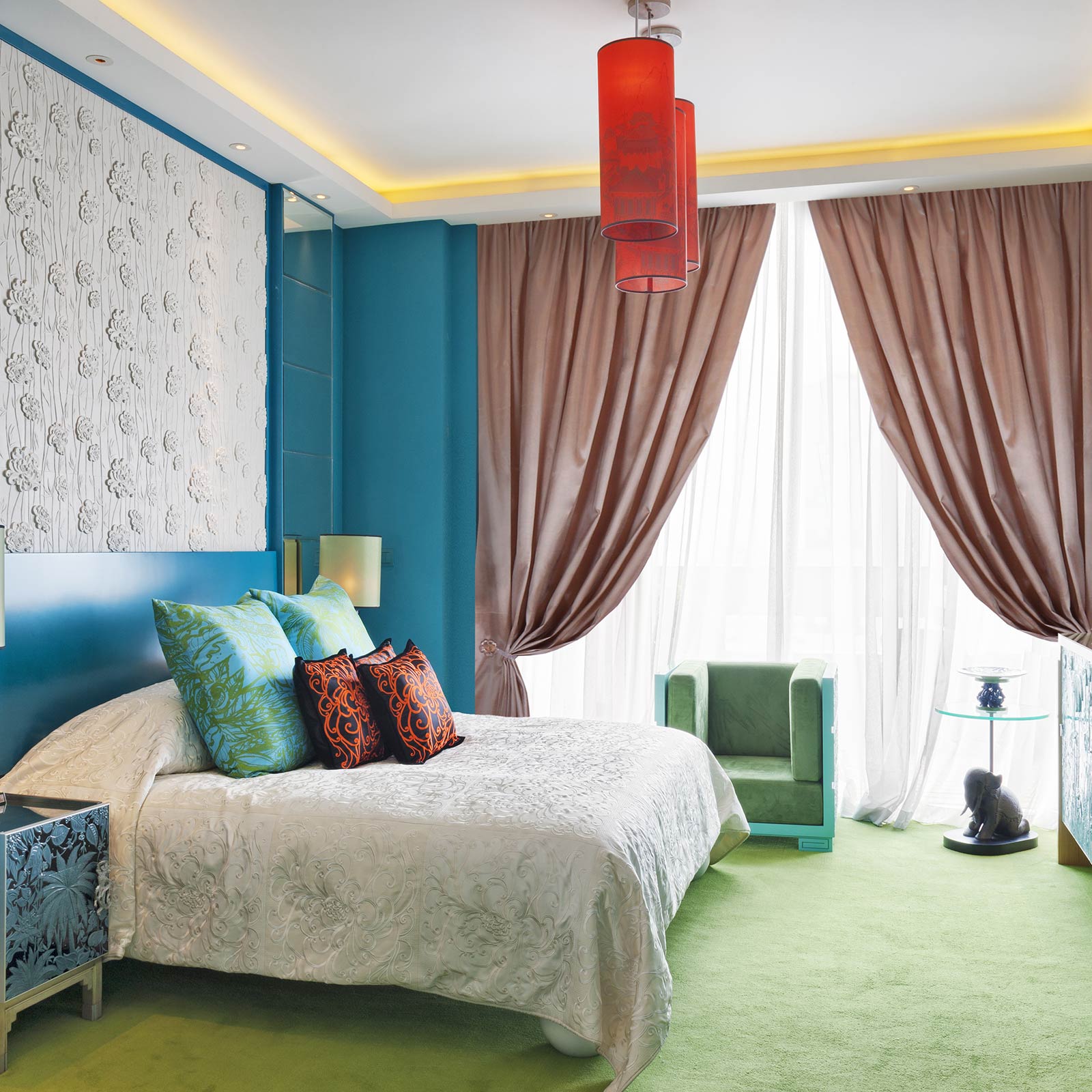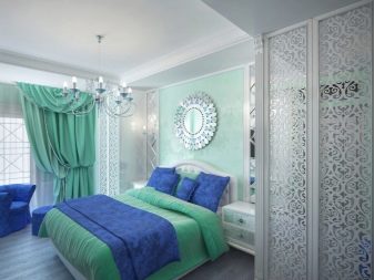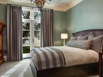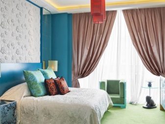 - Arte deco. El estilo de los contrastes, por lo que el color de las cortinas debe ser el opuesto al color de las paredes del dormitorio.