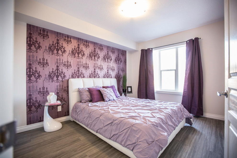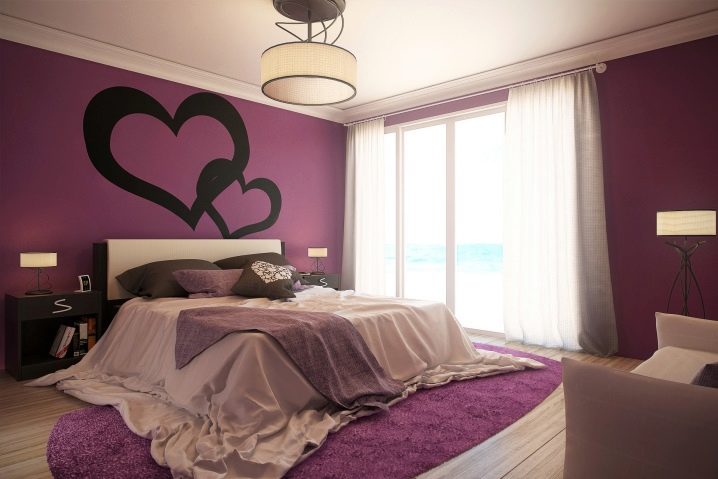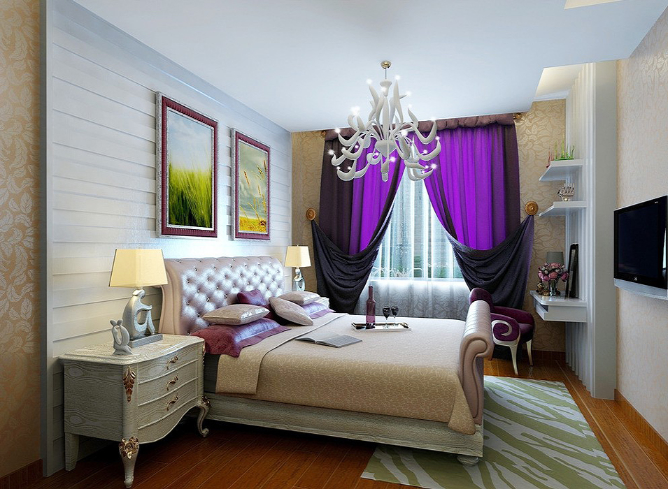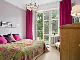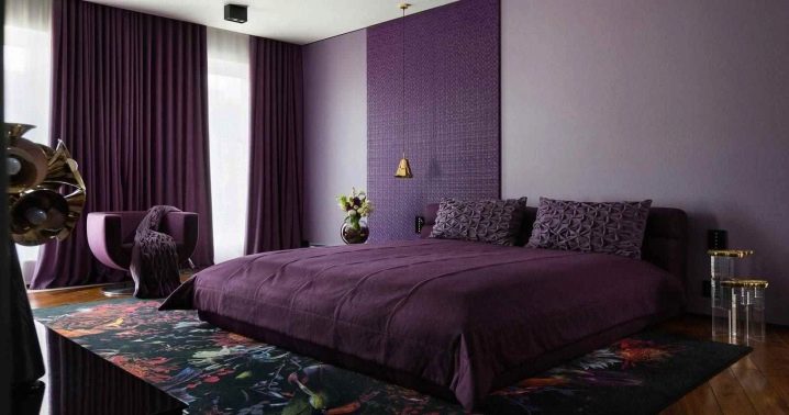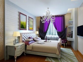 Púrpura. Un color rico y oscuro que rara vez se usa para la decoración de dormitorios. Sin embargo, si se encuentra un diseño de este tipo, vale la pena elegir cortinas lavanda, amarillo o carmesí. Las cortinas doradas, naranjas y blancas se verán igual de bien.