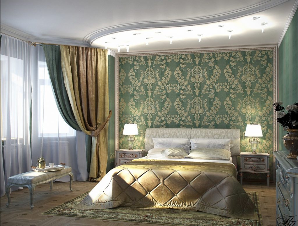 Clásico. Básicamente, se usa papel tapiz liso para decorar la habitación. Para ellos, puedes comprar cortinas clásicas italianas y romanas: voluminosas y densas.