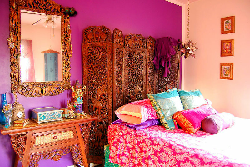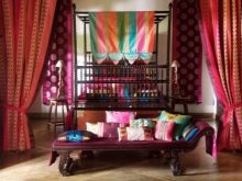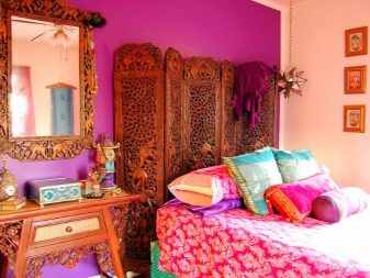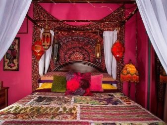 Un dormitorio de estilo indio siempre se distingue por una abundancia de colores brillantes. Las almohadas, una gran cantidad de textiles y literas bastante altas se consideran elementos obligatorios.